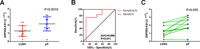 Figure 9: Validation of ZNF503-AS1 based on in-house clinical samples of LUSC. (A) The expression of ZNF503-AS1 between para-tumorous lung tissues (pT) and LUSC (RT-qPCR); (B) ROC curve; (C) The correlation of ZNF503-AS1 between para-tumorous lung tissues (pT) and LUSC.pT: para-noncancerous tissues.