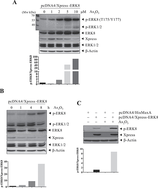 Figure 1: Activation of ERK8 by As2O3 in a dose and time-dependent manner in Xpress-ERK8 transfected cells. HEK293T cells were transfected with pcDNA4/HisMaxA control or pcDNA4/Xpress-ERK8 expression plasmids (6 μg). At 24 h post-transfection, they were cultured in serum-free medium for 24 h, after which they were sham exposed or exposed to As2O3 and monitored. (A) 1 to 10 μM As2O3 for 4 h; (B) 5 μM As2O3 for 1 to 8 h; and (C) 5 μM As2O3 for 4 h. Cells were lysed, and protein extracts were subjected to SDS-PAGE followed by immunobloting using antibodies against p-ERK8 (Thr175/Tyr177). After development, the membranes were stripped and reprobed with regular antibodies against ERK8, Xpress, ERK1/2, and β-actin to monitor the total level of ERK8, ERK1/2, and loading difference, respectively. The data are representative of three independent experiments.