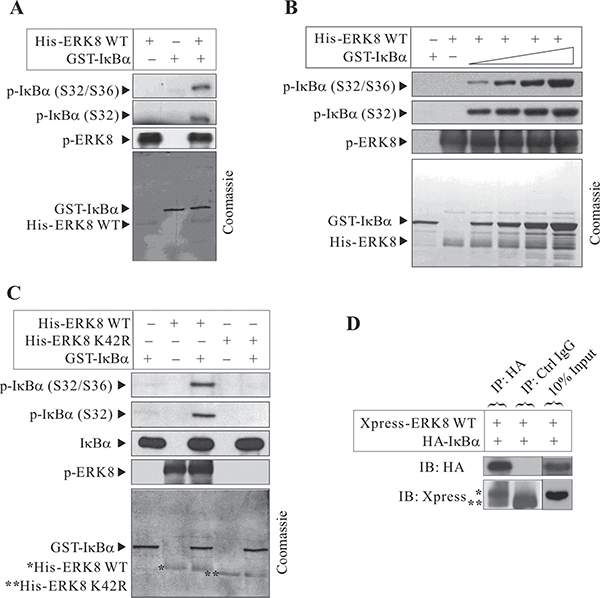 Figure 2: ERK8 phosphorylates and interacts with IκBα. In vitro kinase assays were conducted using (A) recombinant active His-ERK8 WT and GST-IκBα; (B) recombinant active His-ERK8 WT and increasing amounts of GST-IκBα; and (C) recombinant active (WT) or kinase dead (K42R) His-ERK8 and GST-IκBα as described in “Materials and methods”. Western blot analyses of IκBα phosphorylation after the kinase assays using phospho-specific antibody against p-IκBα (Ser32) or p-IκBα (Ser32/Ser36) were conducted. p-ERK8 levels signifies its kinase activity which could be detected in active His-ERK8 WT but not the ERK8 K42R mutant. (D) Xpress-ERK8 WT and HA-IκBα expression plasmids (3 μg of each) were transiently transfected into HEK293T cells. At 24 h post-transfection, they were cultured in serum-free medium for 24 h, after which they were exposed to 10 μM MG132 for 4 h. IκBα was immunoprecipitated (IP) with anti-HA or Ctrl IgG agarose beads followed by immunoblotting with anti-HA or anti-Xpress antibodies (*, Xpress-ERK8 WT; **, IgG heavy chain). For (A), (B), and (C), the corresponding gels are stained with Coomassie Blue to monitor equal protein loading (bottom panels of each). In (C), *, His-ERK8 WT; **, His-ERK8 K42R). The data are representative of three independent experiments.