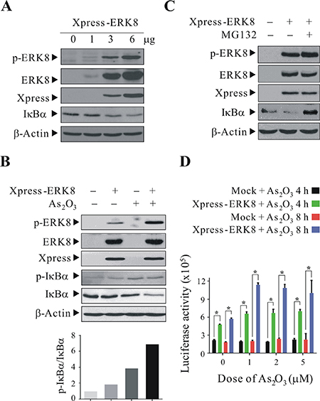 Figure 3: ERK8 promotes the phosphorylation and degradation of IκBα. HEK293T cells were transfected with Xpress-ERK8 expression plasmid. At 24 h post-transfection, they were cultured in serum-free medium for 24 h, after which they were exposed to 5 μM As2O3 for 4 h. (A) cells transfected with 1 to 6 μg Xpress-ERK8 expression plasmid; (B) cells transfected with 6 μg Xpress-ERK8 expression plasmid; (C) cells transfected with 6 μg Xpress-ERK8 expression plasmid, and prior to As2O3 treatment, cells were first pretreated with 10 μM MG132 for 4 h. Cells were lysed, and protein extracts were subjected to SDS-PAGE followed by immunobloting using antibodies against p-ERK8 and p-IκBα (Ser32/Ser36). After development, the membranes were stripped and reprobed with regular antibodies against ERK8, Xpress, IκBα, and β-actin to monitor the total level of ERK8, IκBα and loading difference, respectively. The intensities of the bands of p-IκBα and IκBα in (B) were quantified and expressed as relative ratios, setting 1 for control. (D) NF-κB luciferase assay using NIH/3T3 cells treated with As2O3. NIH/3T3 cells seeded at 6 cm dish were transient transfected with ERK8 expressing plasmid (6 μg) along with the 5× kB luciferase reporter plasmid (6 μg) and the Renilla luciferase reporter plasmid (150 ng). At 24 h post-transfection, they were seeded into 24 well-plate at 1 × 105 cells/well. After 24 h, they were sham-exposed or exposed to 1, 2, or 5 μM As2O3 for additional 4 and 8 h. NF-κB-luciferase activity was measured and normalized against Renilla luciferase activity as described in “Materials and methods”. *A significant difference of P < 0.05. The data are representative of three independent experiments.