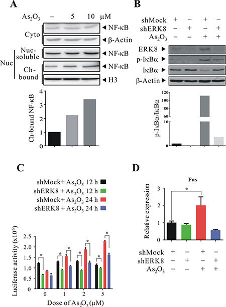 Figure 4: ERK8 promotes the phosphorylation and degradation of IκBα, as well as nuclear translocation of NF-κB in human lung cancer cells. (A) H1299 cells were treated with 5 μM As2O3 for 4 h; individual subcellular fractions (cytoplasmic, nuclear-soluble, and chromatin-bound) were isolated and subjected to western blot analysis using NF-κB p65 antibody. The same blot was stripped and reprobed with the monoclonal β-actin or histone H3 antibody to monitor the loading difference. The intensities of the bands of chromatin-bound NF-κB and histone H3 were quantified and expressed as relative ratios, setting 1 for control. (B) Stable mock control (shMock) and ERK8 knockdown (shERK8) H1299 cells were cultured in serum-free medium for 24 h, after which they were exposed to 5 μM As2O3 for 4 h. Cells were lysed, and protein extracts were subjected to SDS-PAGE followed by immunobloting using antibodies against ERK8 and p-IκBα (Ser32/Ser36). After development, the membranes were stripped and reprobed with regular antibodies against IκBα and β-actin to monitor the total level of IκBα and loading difference, respectively. The intensities of the bands of p-IκBα and IκBα were quantified and expressed as relative ratios, setting 1 for control. (C) NF-κB luciferase assay using shMock and shERK8 H1299 cells treated with As2O3. Stable shMock and shERK8 H1299 cells at 6 cm dish were transient transfected with the 5× κB luciferase reporter plasmid (6 μg) and the Renilla luciferase reporter plasmid (150 ng). At 24 h post-transfection, they were seeded into 24 well-plate at 1 × 105 cells/well. After 24 h, they were sham-exposed or exposed to 1, 2, or 5 μM As2O3 for additional 12 and 24 h. NF-κB-luciferase activity was measured and normalized against Renilla luciferase activity as described in “Materials and methods”. (D) Quantitative real-time RT-PCR to determine the mRNA level of NF-κB downstream gene Fas in stable shMock and shERK8 H1299 cells treated with 5 μM As2O3 after serum starvation for 24 h. β-Actin was used as an internal control. *A significant difference of P < 0.05. The data are representative of three independent experiments.