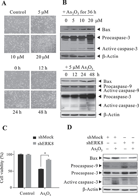 Figure 5: As2O3 promotes cell death in high ERK8-expressing lung cancers. Dose- and time-dependent cytotoxicity of As2O3 towards H1299 cells. H1299 cells were sham-exposed or exposed to 5-20 μM of As2O3 for 36 h or 5 μM As2O3 for 12-48 h. (A) cell morphology of H1299 cells under light microscope. (B) The corresponding western blot of (A), cells were lysed and protein extracts were subjected to western blot analyses using antibodies against Bax, Caspase-9, and Caspase-3. After development, the membranes were stripped and reprobed with β-actin to monitor the loading difference. (C) Stable shMock and shERK8 H1299 cells were sham-exposed or exposed to 5 μM As2O3 for 48 h, the percentage of cell viability was determined by MTS assay. *A significant difference of P < 0.05. (D) The corresponding western blot of (C) for the determination of marker proteins involved in apoptosis. The data are representative of three independent experiments.
