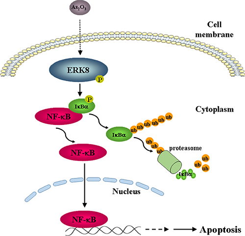 Figure 7: A model of As2O3 action based on our data is presented. As2O3 treatment induces the phosphorylation of ERK8 and activated ERK8 subsequently promotes the phosphorylation and degradation of IκBα, which leads to the activation of NF-κB and lung cancer cell apoptosis.