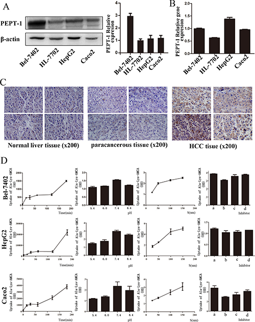Figure 1: The previous research results were presented. The expression of PEPT1 in liver normal cell line HL-7702, hepatocarcinoma cell lines (Bel-7402, HepG2) and human colon cancer cell line Caco-2 by Western blotting (A) and Real-time RT-PCR (B). The expression of PEPT1 based on immunohistochemistry in different liver tissues (C, D): The uptake of Ala-Lys-AMCA under different conditions, from left to right was the uptake at different times (0, 15, 30, 60, 120, 180 min), at different pH values (5.4, 6, 7.4, 8.4), at different concentrations (25 μmol/L, 50 μmol/L, and 150 μmol/L) and at diffrernt inhibitors (a: without inhibitor, b with inhibitor Gly-Sar, c: with inhibitor Gly-Sar, Gly-Gln, d: with inhibitor Gly-Gly-Gly).
