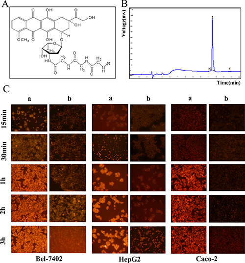 Figure 2: (A) The structure of Doxorubicin-tripeptide conjugate. (B) The identification of Doxorubicin-tripeptide conjugate by HPLC. (C) The drug uptake of HCC cells by fluorescence microscope, a: Doxorubicin-tripeptide conjugate, b: Doxorubicin.