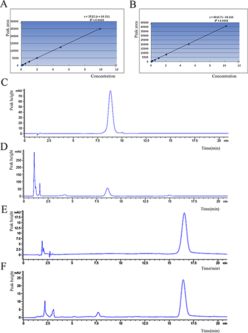 Figure 3: The standard curve of drugs, (A) Doxorubicin-tripeptide conjugate, (B) Doxorubicin. The Analysis by HPLC, (C) the standard product of Doxorubicin-tripeptide conjugate, (D) The intracellular extraction of Doxorubicin-tripeptide conjugate, (E) the standard product of Doxorubicin, (F) The intracellular extraction of Doxorubicin.