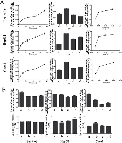 Figure 4: (A) The uptake of Doxorubicin-tripeptide conjugate under different conditions, from left to right was the uptake at different times (0, 15, 30, 60, 120, 180 min), at different pH values (5.4, 6, 7.4, 8.4), at different concentrations (25 μmol/L, 50 μmol/L, and 150 μmol/L) . (B) The competitive inhibition test of drugs. The above graph: Doxorubicin-tripeptide conjugate, The below graph: Doxorubicin, a: without inhibitor, b with inhibitor Gly-Sar, c: with inhibitor Gly-Sar Gly-Gln, d: with inhibitor Gly-Gly-Gly.