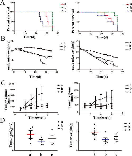 Figure 5: The effects of drugs on mice in survival time, mice weight and tumor inhibition. (A) Mice survival was estimated by Kaplan-Meier survival analysis, The Changes in mice weight (B) and tumor volume (C) during the treatment period, (D) The tumor weight at the end of treatment. a: Control group, b: Doxorubicin-tripeptide conjugate group, c: Doxorubicin group.
