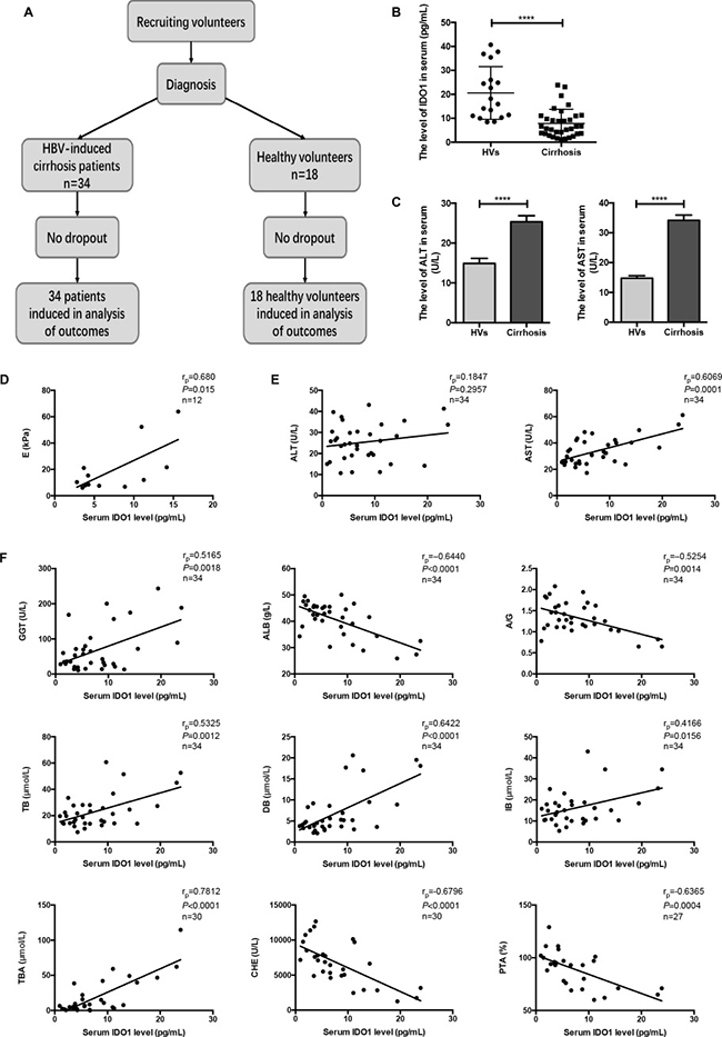 Figure 1: The serum level of IDO1 was decreased in patients with HBV-induced cirrhosis and positively correlated with the degree of cirrhosis. (A) Participant flow diagram illustrating the two study groups. (B) ELISA evaluating the serum IDO1 level in participants. (C) The serum levels of ALT and AST in participants were detected with an automatic biochemical analyser. (D) Pearson’s linear correlation tests for IDO1 and liver stiffness value in patients. (E) and (F) Pearson’s linear correlation tests for IDO1, ALT, AST, GGT, ALB, DB, TBA, CHE and PTA levels in patients’ serum. rp: Pearson’s correlation coefficient. The data are presented as the means ± SEM (*P < 0.05, **P < 0.01, ***P < 0.001, ****P < 0.0001).
