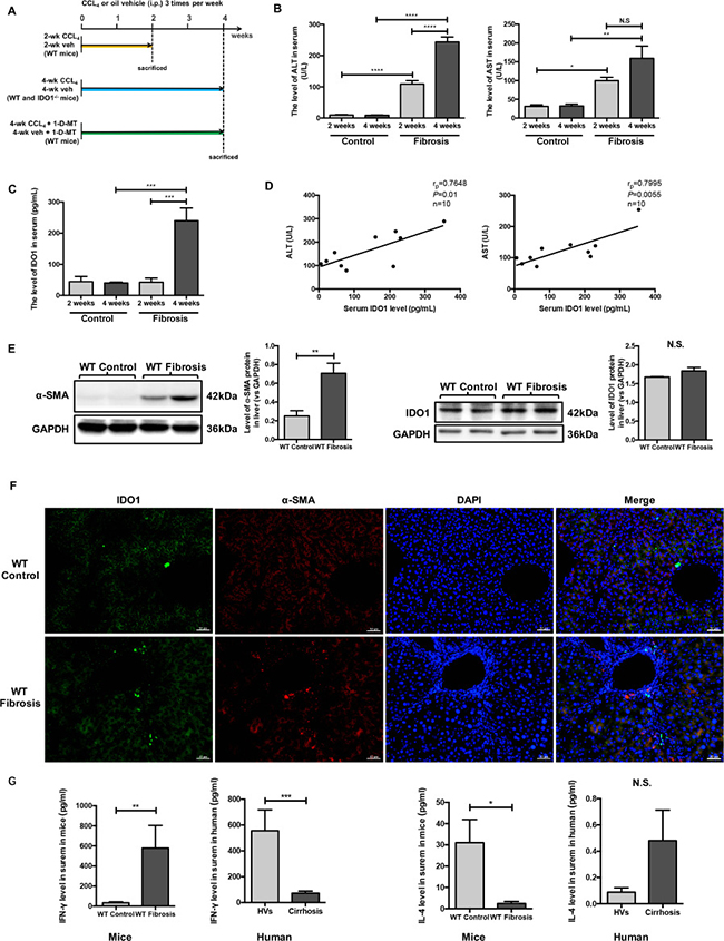Figure 2: Serum IDO1 was time-dependently elevated in a CCl4-induced fibrosis mouse model and positively correlated with liver lesions. (A) Experimental plan for mice. (B) Liver lesions were assessed by measuring serum ALT and AST levels in WT control and model mice. (C) ELISA for detecting serum IDO1 level in WT control and model mice. (D) Pearson’s linear correlation tests for serum IDO1, ALT and AST levels in the WT model mice. (E) Western blot analysis of the expression of IDO1 and α-SMA in the livers of WT control and model mice (4-week). (F) Immunofluorescence analysis to detect the expression of IDO1 and α-SMA in the livers of WT control and model mice (4-week). (G) ELISA for detecting serum IFN –γ and IL-4 in mice and clinical subjects. The data are presented as the means ± SEM (*P < 0.05, **P < 0.01, ***P < 0.001, ****P < 0.0001).