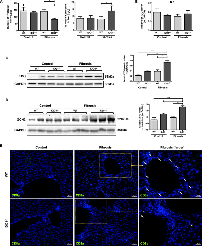 Figure 4: IDO1 deficiency elevated the expressions of TDO and GCN2 kinase during liver fibrosis. (A) LC-MS/MS analysis to detect the concentrations of TRP and KYN in liver tissues of WT and IDO1–/– mice. (B) Quantitative real-time PCR analysis to detect TDO mRNA in the liver tissues of WT and IDO1–/– mice. (C) and (D) Western blot analysis of the expression of TDO and GCN2 kinase in the livers of WT and IDO1–/– mice. (E) Immunofluorescence analysis to detect the expression of CD8a in the livers of WT and IDO1–/– mice. The data are presented as the means ± SEM (*P < 0.05, **P < 0.01, ***P < 0.001, ****P < 0.0001).