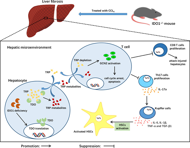 HSCs, hepatic stellate cells; ECM, extracellular matrix; Th17, T helper 17; IL-17a, interleukin 17a; IDO, indoleamine 2,3-dioxygenase; TRP, tryptophan; KYN, kynurenine; IFN-γ, interferon-γ; IL-4, interleukin 4; GCN2, general control nonderepressible 2; CCl4, carbon tetrachloride; HBV, hepatitis B virus; HVs, healthy volunteers; ALT, alanine transaminase; AST, aspartate transaminase; GGT, γ-glutamyl transferase; ALB, albumin; A/G, albumin/globulin; TB, total bilirubin; DB, direct bilirubin; IB, indirect bilirubin; TBA, total bile acid; CHE, cholinesterase; PTA, prothrombin time activity; α-SMA, α-smooth muscle actin; WT, wide-type; BAX, Bcl-2 associated X protein; TUNEL, terminal deoxynucleotidyl transferase dUTP nick end labeling; 1-D-MT, 1-Methyl-D-tryptophan; TDO, tryptophan 2,3-dioxygenase; IL-6, interleukin-6; IL-1β, interleukin-1β; TNF-α, tumor necrosis factor-α; TGF-β1, transforming growth factor-β 1; STAT3, signal transducer and activator of transcription 3; HCV, hepatitis C virus; SEM, S-nitrosothiol.