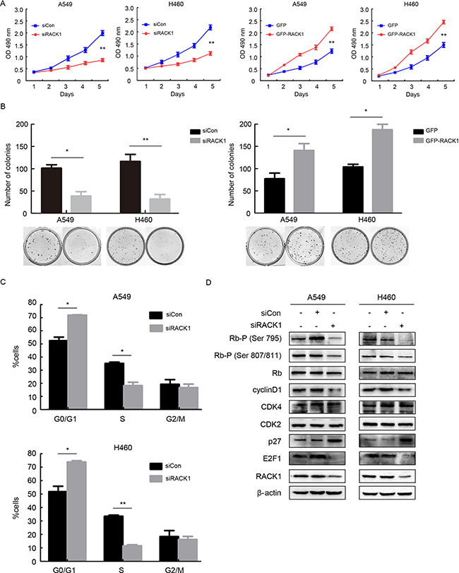 Figure 1: RACK1 promotes cellular proliferation by regulating G1/S progression in NSCLC cells. A549 and H460 cell lines were transfected with siRNA RACK1 (siRACK1), siRNA control (siCon), pEGFP-N1-RACK1 (GFP-RACK1), or pEGFP-N1 (GFP) as indicated. (A) MTT assays for A549 and H460 siRACK1, siCon, GFP-RACK1, and GFP cells. (B) A549 and H460 cells were plated in 40-mm dishes 24 h after transfection and cultured in media supplemented with 10% FBS for 12 days, after which the number of colonies with more than 50 cells was counted. (C and D) A549 and H460 cells were synchronized at the G0/G1 phase by serum starvation, cell cycle progression was then triggered by the addition of 10% FBS for 4h, and flow cytometry (C) and the activity of G1 cell cycle regulators (D) were analyzed to evaluate cell cycle progression.