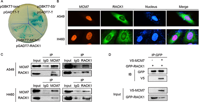 Figure 2: RACK1 interacts with MCM7. (A) pGBKT7-MCM7 and pGADT7-RACK1 co-transformants were grown on SD agar plates with highly stringent nutrient selection (SD-Leu-Trp-His-Ade). pGBKT7-p53 and pGADT7-T-antigen co-transformants were the positive control and pGBKT7-lam and pGADT7-T-antigen co-transformants were the negative control. (B) Immunofluorescence staining of A549 and H460 cells with anti-RACK1 primary and anti-mouse FITC-conjugated secondary antibodies and with anti-MCM7 primary and anti-rabbit TRITC-conjugated secondary antibodies. (C) Co-immunoprecipitation (IP) of RACK1 (left) or MCM7 (right) in A549 and H460 cells. The immunoprecipitates were immunoblotted (IB) with the indicated antibodies. (D) A549 cells were transfected with GFP-RACK1 and V5-MCM7, cell lysates were immunoprecipitated with GFP antibody, and immunoblotting was performed with GFP or V5 antibody.