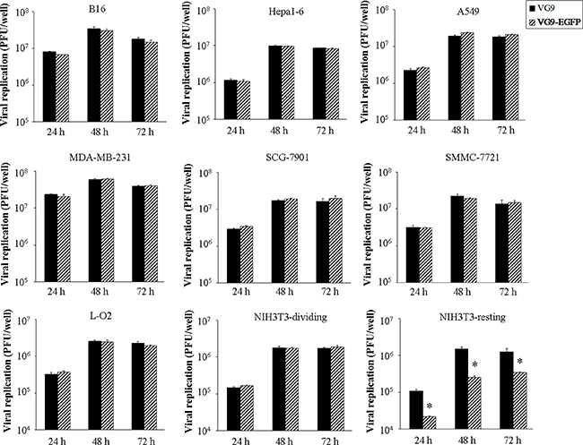 Figure 2: Viral replication in vitro. Various cancer cell lines (B16, Hepa1-6, A594, MDA-MB-231, SCG-7901, SMMC-7721) and two normal cell lines (L-O2, NIH3T3) in 12-well plate were infected with VG9 or VG9-EGFP at 0.1 MOI and samples were collected at indicated times. Virus titers were determined on BSC-40 cells. Each bar represents the mean ± SD (n = 3). *p < 0.05 versus VG9 group.