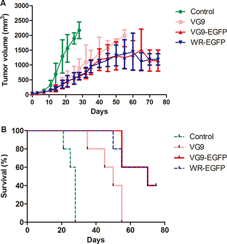 Figure 6: Antitumor efficacy in a human hepatoma tumor model. (A) Mean tumor volume in mice treated with PBS (Control group), VG9 (VG9 group), or TK-deleted vaccinia virus (VG9-EGFP group, WR-EGFP group). (B) Kaplan-Meier survival curves for tumor-bearing mice treated with PBS (Control group), VG9 (VG9 group), or TK-deleted vaccinia virus (VG9-EGFP group, WR-EGFP group). n = 5 per group.