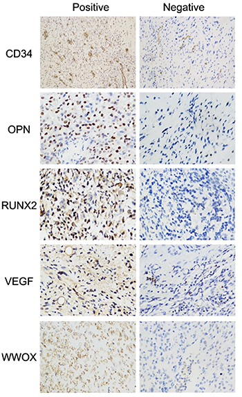 Figure 1: Representative immunohistochemical staining of WWOX, VEGF, RUNX2, OPN, and CD34 in osteosarcoma specimens. Images for WWOX, VEGF, RUNX2, and OPN were taken under 400× magnification, and for CD34 were taken under 200 × magnification.