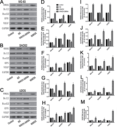 Total RNA was isolated from cells using Trizol reagent (Invitrogen, USA) according to the manufacturer’s instructions. 1.0 μg of RNA from each sample was reverse-transcribed into cDNA and subjected to real-time PCR using SYBR® Green PCR Master Mix (TOYOBO). The primers used for real-time PCR were as follows: WWOX forward 5′-GGA CCC AAG ACT GGC GTT TA-3′, reverse 5′-GTG ACC ACA ACC ACT TTG CC-3′; RUNX2 forward 5′-TTA CCC CTC CTA CCT GAG CC-3′, reverse 5′-CCT AGG CAC ATC GGT GAT GG-3′; bcl-2 forward 5′-GAC TTC GCC GAG ATG TCC AG-3′, reverse 5′-CAA TCC TCC CCC AGT TCA CC-3′; VEGF forward 5′-ACT GCC ATC CAA TCG AGA CC-3′, reverse 5′-CTC CAG GCC CTC GTC ATT G-3′; OPN forward 5′-TCC CTC GAT GTC ATC CCT GT-3′, reverse 5′-CCC TTT CCG TTG TTG TCC TG-3′; GAPDH forward 5′-ACC CAG AAG ACT GTG GAT GG-3′, reverse, 5′-TCT AGA CGG CAG GTC AGG TC-3′. GAPDH mRNA level was used as a reference for the other genes, and the relative mRNA levels of the treatment groups were compared to those of the controls. All experiments were independently performed three times.