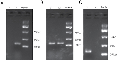 DNA samples were extracted from the decalcified osteosarcoma tissue samples (about 30mg) according to the protocol of the Ezup column animal genome DNA Extraction Kit (Shanghai Shengong Bioengineering Co, Ltd China). The concentration of DNA was determined using UV spectrophotometry and the DNA samples with A260/A280:1.8–2.0 were used for DNA methylation assay according to the protocol of the CpGenomeTM Fast DNA Modification bisulfite Kit (Chemicon company, USA). MSP primers were synthesized by Guangzhou Youdi biotech Co. Ltd. The primer sequences for the methylated WWOX gene promoter were: forward 5′-TAT GGG CGT CGT TTT TTT AGT T -3′, and reverse 5′-CAA TCT CCG CAA TAT CGC GAC A -3′. The primer sequences for the unmethylated WWOX gene promoter were: forward 5′-TAT GGG TGT TGT TTT TTT AGT T -3′, and reverse 5′-CAA TCT CCA CAATAT CAC AAC A -3′. 5 μl PCR products were resolved by 1.5% agarose gel electrophoresis analysis, photographed under ultraviolet light. If the promoter was completely methylated, only PCR product from methylation primers was seen. If the promoter was unmethylated, only PCR product from unmethylation primers was seen. If the promoter was partially methylated, both PCR products from methylation primers and unmethylation primers were seen.