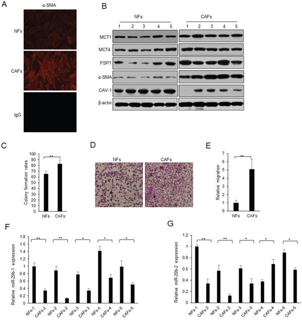 Figure 1: Lack of miR-29b expression in CAFs. (A) α-SMA expression in CAFs and NFs by immunofluorescence assay. (B) Markers of CAFs and NFs from breast cancer tissues were examined by western blotting. (C) Colony formation rates of SKBR3 cells with CM treatment from NFs or CAFs. (D) Migration ability of SKBR3 cells with CM treatment from NFs or CAFs. (E) Data analysis from D. (F-G) miR-29b-1-5p and miR-29b-2-5p expression in CAFs and NFs by real time RT-PCR. The data were shown as means±s.d. collected from three independent experiments. *: p<0.05, **: p<0.01, and -: no significance.