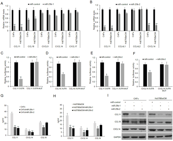 Figure 3: MiR-29b regulates CCL11 and CXCL14 expression in fibroblasts. (A) miR-29b-1 restoration down-regulated CCL11 and CCL18 mRNA in CAFs and Hs578Bst fibroblasts treated with conditioned medium from cancer (Hs578BstCM). Cells were transfected with miR-29b-1 or miR-control for 48 hours, then collected for real-time PCR. (B) miR-29b-2 restoration down-regulated CCL11 and CXCL14 mRNA in CAFs and Hs578BstCM. Cells were transfected with miR-29b-2 or miR-control for 48 hours, then collected for real-time PCR. (C-D) miR-29b-1 suppressed the expression of a luciferase reporter gene harboring the 3’-UTR of CCL11 or CCL18. (E-F) miR-29b-2 suppressed the expression of a luciferase reporter gene harboring the 3’-UTR of CCL11 and CXCL14. (G) Cells were transfected with miR-29b-1, miR-29b-2 or miR-control for 48 hours, then collected for ELISA. (I) Cells were transfected with miR-29b-1, miR-29b-2 or miR-control for 48 hours, then collected for western blotting. The data were shown as means±s.d. collected from three independent experiments. *:p<0.05, **: p<0.01.