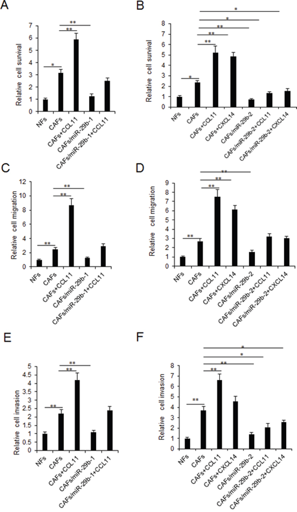 Figure 4: MiR-29b restoration in CAFs inhibits breast cancer cellular viability and metastasis by targeting CCL11 and CXCL14. CAFs were transfected with miR-29b mimics or treated with CCL11 or CXCL14 for 24h and then co-cultured with breast cancer cells. (A-B) MTT assay was used to test cell proliferation at day 3. (C-D) Cell migration was assayed by transwell chamber system. (E-F) Cell invasion was assayed by transwell chamber system. The data were shown as means±s.d. collected from three independent experiments. *: p<0.05, **: p<0.01.