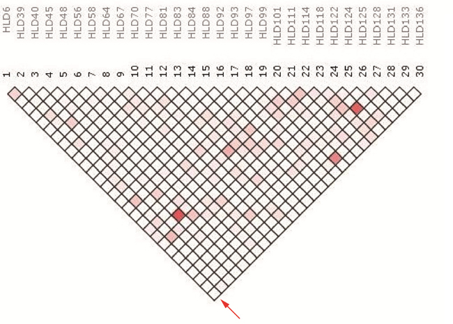 The results of LD (linkage disequilibrium) were shown on the form of an inverted triangle (Figure 1). As shown by the red arrow, the pairwise LD between the locus HLD6 and the rest 29 loci were arranged in the left bottom (29 square grids). The others were performed so on. No red color area embraced with thick black curve was observed in the linkage disequilibrium graph.