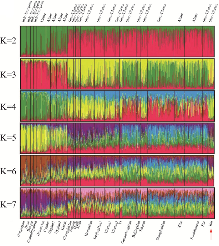 Figure 2: Clustering structure for the full-loci dataset assuming K= 2-7 of the Bai group with other groups. Population names were labeled beneath while language names on top.