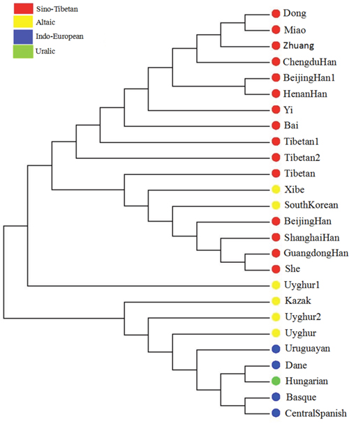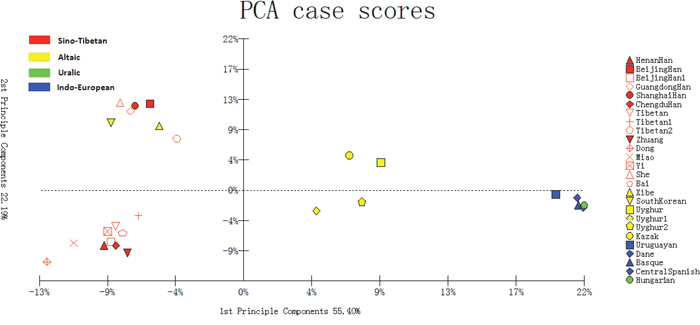 As shown in Figure 3, the European groups and Uruguayan distributed in the right; Chinese 16 populations and South Korean in the left; Uyghur1, Kazak, Uyghur2, and Uyghur groups from China in the middle of them. The result of PCA corresponded with structure analysis and geographic location. The studied Bai group, together with Henan Han, Beijing Han1, Chengdu Han, Dong, Miao, Zhuang, Yi, Tibetan1 and Tibetan groups clustered in the lower left quadrant, which indicated their close genetic relationships.
