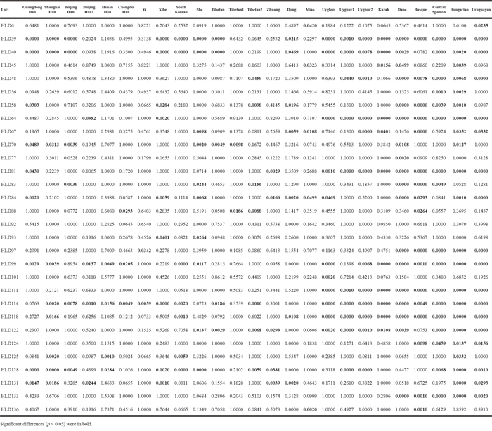 In the aspects of 30 loci, the highest ethnic diversity was found at HLD114 locus which reflected significant differences between the studied Bai group and other 19 groups. By contrast, no significant differences were observed at HLD92 locus between the Bai group and other 25 groups. Similar to STRs [36, 37], the ability of Indels to distinguish ethnic groups was at various levels. Along with more typing data of different populations at novel Indel loci, evolution in human history would be investigated comprehensively and detailedly.