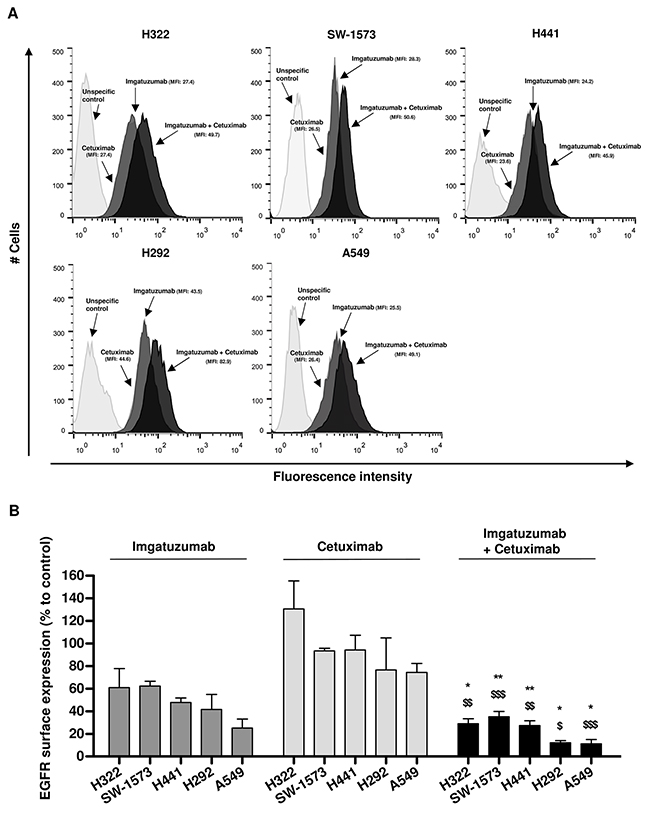 Figure 1: Effect of anti-EGFR monoclonal antibody treatment on EGFR surface expression levels. (A) Flow cytometric analysis of imgatuzumab and cetuximab binding alone or in combination in H322, SW-1573, H441, H292 and A549 cells. (B) H322, SW-1573, H292, H441 and A549 cells were treated with the anti-EGFR monoclonal antibodies (20 μg/mL total) for 72 hours. Surface expression levels were determined using flow cytometry. The surface expression in untreated control cells was set at 100% both for the single antibodies and the combination. (*P < 0.05, **P < 0.01 combination vs imgatuzumab; $P < 0.05, $$P < 0.01, $$$P < 0.001 combination vs cetuximab; unpaired t-test). Data points are mean + SD (n = 3).