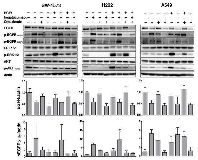 Figure 2: Western blot analysis of the effect of 24 hours anti-EGFR monoclonal antibody treatment on EGFR total protein levels and downstream signaling under normal growth conditions or 15 min EGF stimulation (10 ng/mL). The immunoreactive spots were quantified by densitometric analysis and normalized using actin (see also Supplementary Figure 2). Values are expressed as fold increase versus control + SD. All experiments were performed in triplicate.
