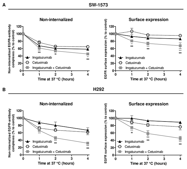 Figure 3: Influence of monoclonal antibody binding on EGFR internalization and surface expression. SW-1573 (A) and H292 cells (B) were surface labeled with the anti-EGFR monoclonal antibodies on ice and incubated at 37 °C for the indicated times, and then analyzed for the non-internalized EGFR-antibody complexes (left) and cell surface expression (right). The lower the amount of non-internalized EGFR-antibody complexes, the higher the amount of internalized antibody-EGFR complexes. The surface expression at t=0 was set at 100%. The non-internalized and surface expression were determined as described in Materials and Methods (n=3). Data points are mean ± SD. (**P < 0.01, ***P < 0.001 combination vs imgatuzumab; $$P < 0.01, $$$P < 0.001 combination vs cetuximab; two-way ANOVA followed by Bonferroni post-test).