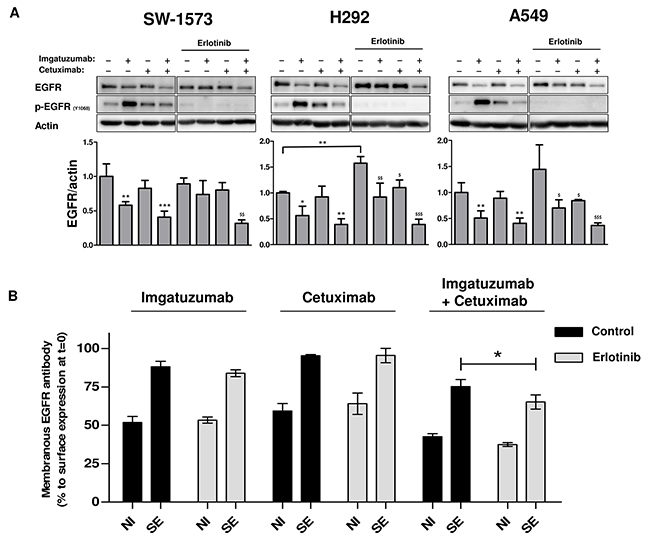Figure 4: Effects of TKI treatment on monoclonal antibody-induced internalization and degradation. (A) Western blot analysis of the effect of 24 hours anti-EGFR monoclonal antibody treatment (20 μg/mL total) with or without erlotinib (10 μM) on EGFR total protein levels in SW-1573, H292 and A549. Data points are mean + SD. (*P < 0.05, **P < 0.01, ***P < 0.001 compared to untreated control; $P < 0.05, $$P < 0.01, $$$P < 0.001 compared to erlotinib treated control). (B) SW-1573 cells were pretreated for 24 hours with the EGFR TKI inhibitor erlotinib (10 μM). Cells were subsequently surface labeled with the anti-EGFR monoclonal antibodies (20 μg/mL total) on ice and incubated at 37 °C for 4 hours, and then analyzed for the non-internalized EGFR-antibody complexes (NI) and cell surface expression (SE). The lower the amount of non-internalized EGFR-antibody complexes, the higher the amount of internalized antibody-EGFR complexes. Surface expression of the control and erlotinib treated cells were both set at 100%. 24 hours erlotinib treatment resulted in a slight upregulation (10 – 15 % increase). Data points are mean ± SD (n = 3). (*P < 0.05).