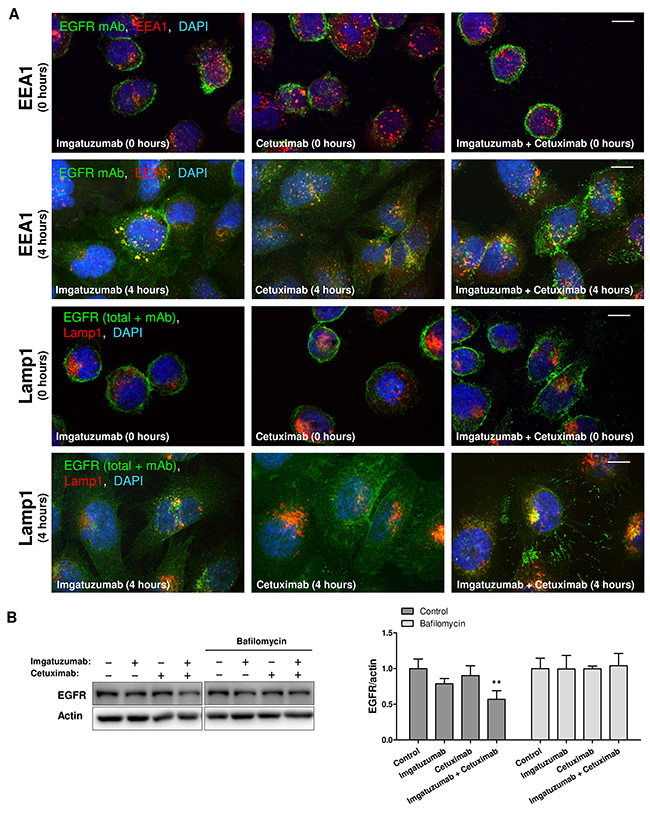 Figure 5: Cellular localization and endocytic trafficking of anti-EGFR monoclonal antibodies in SW-1573. (A) Cells were surface labeled with the anti-EGFR monoclonal antibodies (mAbs) on ice. After staining with the primary antibody cells were washed with ice-cold FACS buffer and incubated for 4 hours at 37 ˚C. After fixation, permeabilization, and incubation with anti-EEA1 and anti-Lamp1 antibodies, cells were incubated with fluorescent secondary antibodies (anti-human Alexa 488 against imgatuzumab and cetuximab (green color), Alexa 647-labeled antibodies for endosomal markers (red color)). For the Lamp1 staining additional anti-EGFR monoclonal antibodies were added to visualize total EGFR. Colocalization appears as yellow (merged images). Images were acquired using a confocal microscope. White scale bars represent 10 μm. (B) Western blot analysis of the effect of lysosomal inhibition on monoclonal antibody-induced EGFR degradation. SW-1573 cells were pretreated for 2 hours with the lysosomal inhibitor bafilomycin A1 (100 nM). Cells were subsequently treated with the anti-EGFR monoclonal antibodies (20 μg/mL total) for 4 hours. Data points are mean + SD. (**P < 0.01 compared to control).