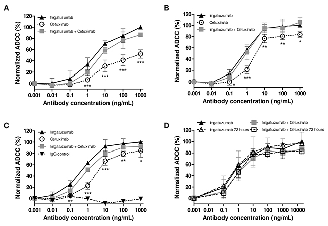 Figure 7: In vitro ADCC analysis of imgatuzumab, cetuximab or the combination. PBMCs as effector cells were added to the untreated H441 (A), H292 (B) or A549 (C) target cells at a ratio of 25:1. ADCC responses were normalized to the ADCC response of the highest imgatuzumab concentration due to variations in responses between PBMCs of different donors. Absolute ADCC responses ranged between 12 and 53%. (*P < 0.05, **P < 0.01, ***P < 0.001 cetuximab vs imgatuzumab). (D) A549 cells were pretreated with imgatuzumab alone (20 μg/mL) or combined with cetuximab (20 μg/mL total) in culture medium for 72 hours. Next, cells with (open triangle and open square) or without (solid triangle and solid square) antibody pretreatment for 72 hours were washed and the ADCC assay was performed using PBMCs as effector cells and A549 cells as target cells at a ratio of 25:1. Data points are mean ± SD (n = 3).