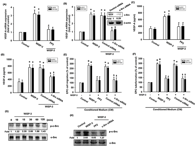 Figure 2: The c-Src pathway is mediated in WISP-3-induced VEGF-A production and angiogenesis. (A-D) Cells were pretreated with c-Src inhibitor (PP2; 3 μM) for 30 min or pretransfected with c-Src siRNA for 24 h, and then stimulated with WISP-3 for 24 h; VEGF-A expression was measured by qPCR (n=5) and ELISA (n=4). The CM was applied to EPCs and analyzed for migration activity (n=4) (E) as well as tube formation activity (n=4) (F). (G) JJ012 cells stimulated with WISP-3 for the indicated times were analyzed by Western blotting with an antibody against c-Src (n=3). (H) JJ012 cells pretreated with pharmacologic inhibitor and siRNA as indicated were then incubated with WISP-3 for 30 min and analyzed by Western blotting with the c-Src antibody (n=3). Quantitative results are expressed as the mean ± SEM. *P < 0.05 as compared with the control group; #P < 0.05 as compared with the WISP-3-treated group; $P < 0.05 as compared with the control siRNA group.