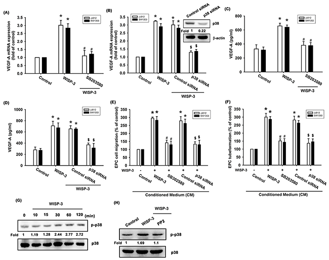 Figure 3: p38 activation is mediated in WISP-3-induced VEGF-A production and angiogenesis. (A-D) Cells were pretreated with p38 inhibitor (SB203580; 10 μM) for 30 min or pretransfected with siRNA for 24 h then stimulated with WISP-3 for 24 h; VEGF-A expression was measured by qPCR (n=5) and ELISA (n=4). The CM was applied to EPCs and analyzed for migration activity (n=4) (E) as well as tube formation activity (n=4) (F). JJ012 cells treated with WISP-3 for the indicated times were analyzed by Western blotting with a p38 antibody (n=3) (G). JJ012 cells pretreated with pharmacologic inhibitor as indicated were then incubated with WISP-3 for 120 min and analyzed by Western blotting with p38 antibody (n=3) (H). Quantitative results are expressed as the mean ± SEM. *P < 0.05 as compared with the control group; #P < 0.05 as compared with the WISP-3-treated group; $P < 0.05 as compared with the control siRNA group.