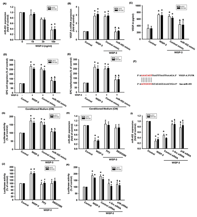 Increasing evidence has suggested that miRNAs are critical regulators of VEGF-A production and angiogenesis during cancer progression [15, 16]. Use of open-source software (PicTar, miRDB, and TargetScan) to predict and identify target miRNAs in this study found that the 3’UTR region of VEGF-A mRNA harbors potential binding sites for 13 candidate miRNAs, and that the greatest downregulation of miR-452 occurs after WISP-3 stimulation (Supplementary Figure 2). Exogenous WISP-3 inhibited miR-452 expression in a concentration-dependent manner (Figure 4A). To investigate whether miR-452 regulated WISP-3-induced VEGF-A expression and angiogenesis, the miR-452 mimic was used. miR-452 mimic transfection diminished WISP-3-enhanced VEGF-A expression (Figures 4B and 4C). Conversely, the miR-452 mimic also inhibited WISP-3-boosted EPC migration and tube formation (Figure 4D and 4E). We then examined whether miR-452 controls the 3’UTR region of VEGF-A (Figure 4F). We found that WISP-3 promoted VEGFA-3’UTR luciferase activity (Figure 4G). Incubation with c-Src and p38 inhibitors or siRNAs reversed WISP-3-mediated miR-452 expression and VEGFA-3’UTR luciferase activity (Figure 4H-4K), indicating that miR-452 inhibits VEGF-A protein production through integration with the 3’UTR region of the human VEGF-A gene via the c-Src and p38 pathways.