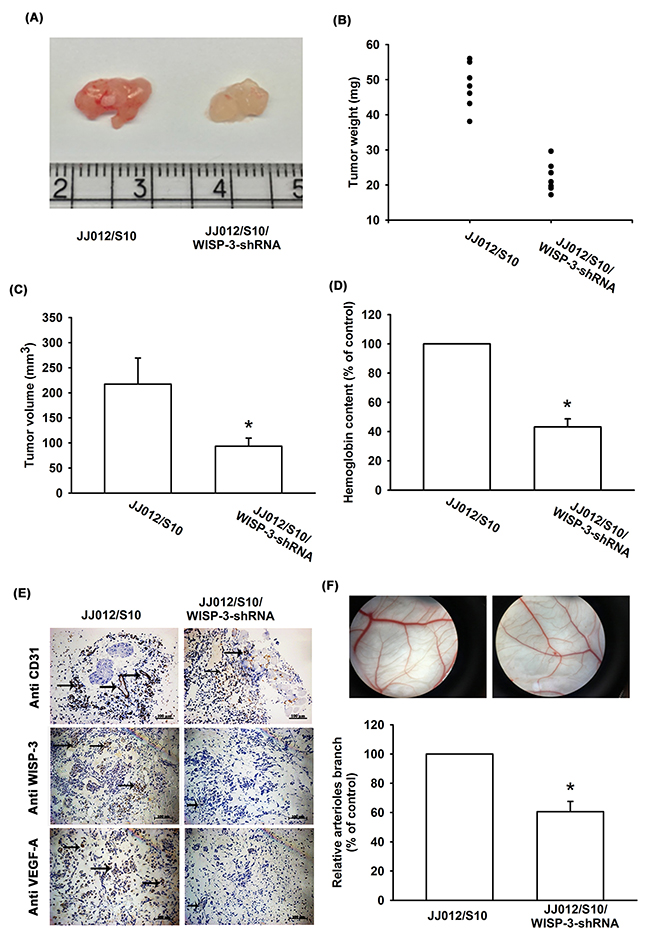 Figure 5: WISP-3 knockdown decreases tumor-induced angiogenesis in vivo. At 28 days after mice were injected, tumor size and weight were measured (n=7) (A-C), and quantified for hemoglobin content (D), as well as embedded in paraffin, and sections were immunostained using CD31, WISP-3, and VEGF-A antibody (E). (F) Chick embryos were incubated for 4 days with CM from JJ012/S10 or JJ012/S10/WISP-3-shRNA cells and then resected, fixed, and photographed with a stereomicroscope (n=5). Quantitative results are expressed as the mean ± SEM. *P < 0.05 as compared with the JJ012/S10 group.