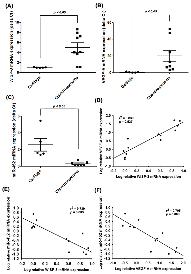 Figure 6: WISP-3, VEGF-A and miR-452 expression have important clinical significance in patients with chondrosarcoma. mRNA expression of WISP-3, VEGF-A, and miR-452 in normal cartilage (n=5) and chondrosarcoma tissue (n=8) were examined by qPCR (A-C). The correlations between WISP-3/VEGF-A (D), WISP-3/miR-452 (E) and VEGF-A/miR-452 (F). Quantitative results are expressed as the mean ± SEM. *P < 0.05 as compared with the cartilage group.