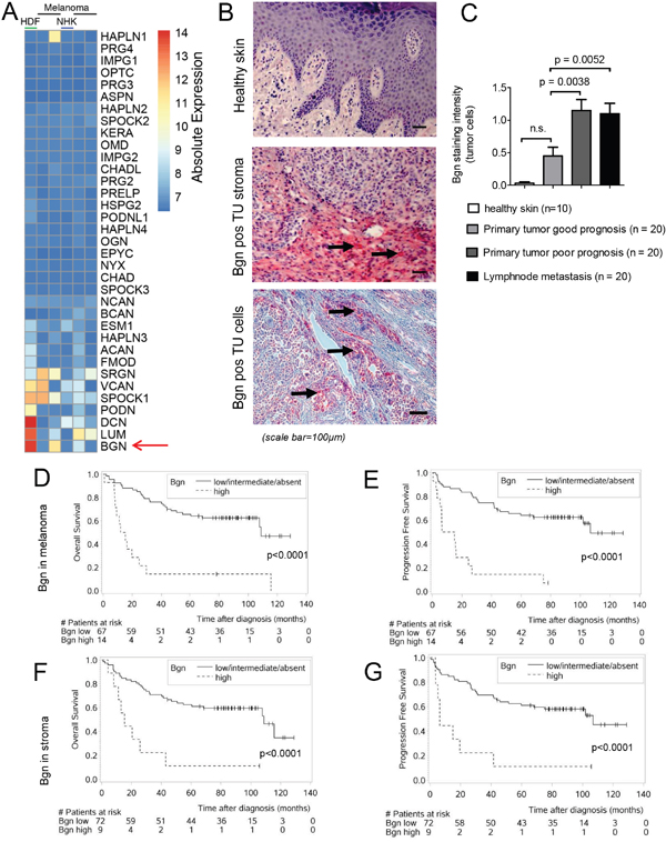 Figure 1: Bgn is highly expressed in melanoma cells and its expression in human melanoma tissue correlates with tumor invasiveness, overall survival and progression-free survival. (A) Expression of proteoglycans in fibroblast and melanoma cell lines. The heatmap shows the absolute log2 transformed expression of proteoglycans genes as defined in Naba et al. [48] for human dermal fibroblasts (HDF), Normal human keratinocytes (NHK) and 4 melanoma cells lines (detailed in the methods). The expression values have been derived from triplicates. Rows and columns have been hierarchically clustered by a complete linkage method according to their Euclidean distances. (B) Representative pictures of human healthy skin, Bgn positive tumor stroma or tumor cells in dermatotropic melanoma metastasis are shown. Immunohistochemical staining for Bgn (red staining, positive cells/areas are indicated by black arrows). (C) Quantitative comparison of Bgn staining in normal skin, melanoma primary tumors with good prognosis, melanoma primary tumors with unfavorable prognosis and melanoma lymph node metastases. Patients characteristics are given in Supplementary Table 1. (D) Overall survival of the two groups stratified according to Bgn expression levels in the melanoma cells. Characteristics of the patients reported in (D-G) are given in Supplementary Table 1. The Bgn level in the melanoma tissue was determined at initial diagnosis in patients with histology-proven malignant melanoma. OS was calculated from the time point of diagnosis until death or last hospital visit. (E) Progression free survival of the two groups stratified according to Bgn expression levels in melanoma cells. (F) Overall survival of the two groups stratified according to Bgn expression levels in tumor stroma. (G) Progression free survival of the two groups stratified according to Bgn expression levels in tumor stroma.