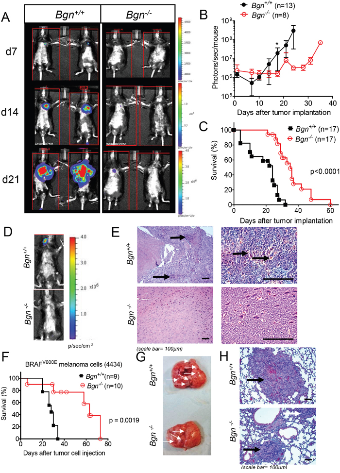 Figure 2: Bgn deficiency of tumor stroma inhibits metastasis formation in vivo. (A) Bgn+/+ and Bgn-/- mice were injected with 1x104 B16 F10 luciferase transgenic cells intravenously. Distribution of tumor cells was followed by means of bioluminescence imaging on consecutive days. Representative images of tumor bearing mice taken over a period of 21 days. (B) The total photon flux over each mouse was quantified in photons/s/mouse as an indicator for the expansion of B16 cells (n=13 or n=8 as indicated). (C) Survival was monitored in the groups described under (A). Data are pooled from three independent experiments (n=17 mice/group, Bgn+/+ versus Bgn-/-: p<0.0001). (D) Bioluminescence imaging of Bgn+/+ or Bgn-/- mice that had received melanoma cells as described under (A). Representative images show BLI signal projection over the head of the mouse. (E) The brain of the mice described in (D) was isolated on after tumor cell injection and representative images are shown for both groups (H&E stain, black arrows: melanin). (F) Survival of Bgn+/+ and Bgn-/- mice injected intravenously with 2x106 BRAFV600E melanoma (4434) cells (n=9 or n=10 mice/group, Bgn+/+ versus Bgn-/-: p=0.0019). (G) The lung was isolated from the groups described under (F) on after tumor cell injection and representative lungs with macroscopically visible metastases are shown for both groups (white arrows point to macroscopically visible metastases). (H) The lungs were isolated as described under (G) and representative sections of lungs are shown for both groups (H&E stain, black arrows point to melanoma metastases).