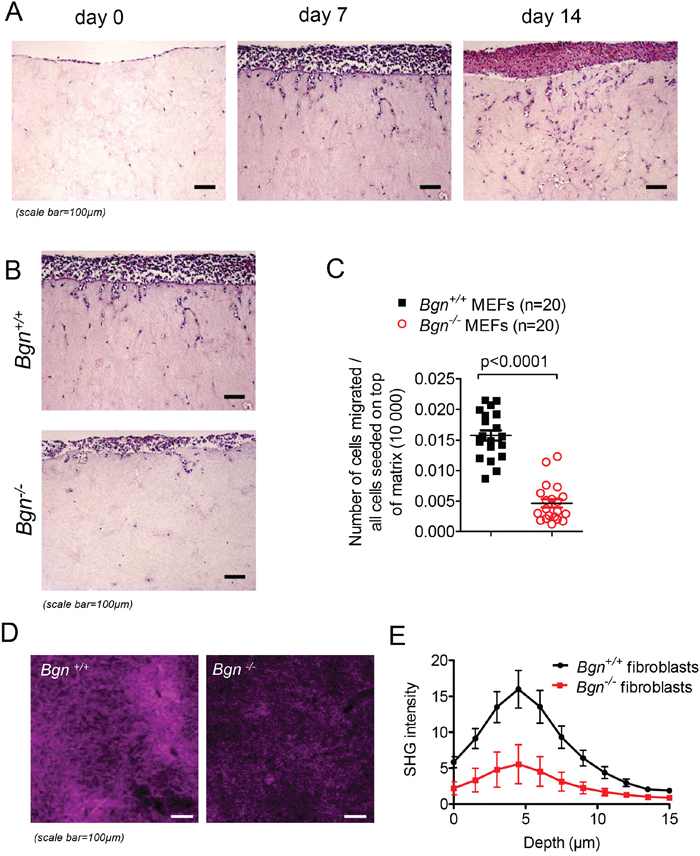 To understand how the lack of Bgn reduced metastasis formation, we next evaluated its impact on cell motility and invasion in vitro. To follow invasive migration of tumor cells in vitro in an environment resembling in vivo conditions as closely as possible, we applied an organotypic invasion assay as previously reported [20]. Mouse embryonic fibroblasts isolated from a Bgn-/- mouse were immortalized by serial passaging and used in comparison to Bgn+/+ mouse embryonic fibroblasts generated the same way. To generate the matrix, fibroblasts were seeded into collagen, the contraction of which was mediated by the ECM molecules secreted by the fibroblasts. The expression of Bgn in WT fibroblasts was confirmed by Western blot (data not shown). To assess the ability of B16 melanoma cells to migrate in this system, cells were seeded at 10,000 cells per membrane and allowed to adhere for three days. Afterwards, the membranes were placed on metal grids and incubated for a predetermined number of days to allow for tumor cell invasion into the membranes. The histological sections were made on consecutive days and the invasive potential of the cells was evaluated. In a first set of experiments we studied invasion kinetics of melanoma cells into a matrix containing only WT fibroblasts. Over time, an increased invasion of melanoma cells was observed (Figure 3A). To understand whether the modification of matrix characteristics by the lack of Bgn has an impact on tumor cell invasion, we compared the invasion into matrices with fibroblasts derived from Bgn-/- mice compared to those derived from Bgn+/+ mice. We observed that invasion of melanoma cells into the collagen matrix was reduced when fibroblasts were lacking Bgn as shown for representative matrix sections (Figure 3B). The ratio of invading cells visible on the sections to the total amount of cells seeded on the top of the matrix was lower when fibroblasts were derived from Bgn-/- mice compared to fibroblasts derived from Bgn+/+ mice (Figure 3C). The same experiment was performed in a different invasion model using isogenic fibroblasts and yielded comparable results (Supplementary Figure 3A-3C). To further assess this phenomenon, we used Second Harmonic Generation (SHG) imaging of collagen matrices following invasion. 3D-SHG imaging revealed a significant reduction of collagen coverage in Bgn-/- matrices compared to Bgn+/+ matrices (Figure 3D, 3E).