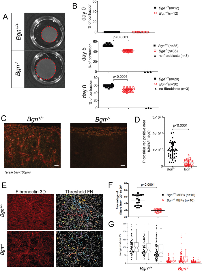 Figure 4: Tissue stiffness is reduced in the absence of Bgn in fibroblasts. (A) Contraction of collagen matrices containing Bgn+/+ or Bgn-/- MEFs as indicated for the respective groups. One representative collagen matrix per group is shown. (B) Measurement of the diameter of multiple collagen matrices containing Bgn+/+ or Bgn-/- MEFs on days 5 and 8 after start of contraction. Quantification was determined as the percentage of the initial membrane that contracted, where 0% was the size of a 35 mm Petri dish at the beginning of contraction on day 0. (C) Images of picrosirius red staining on sections of collagen matrices containing Bgn+/+ or Bgn-/- MEFs. Dense, rigid collagen bundles appear orange-red. (D) The scatter plot shows quantification of picrosirius red positive areas (in pixels), n ≥ 9 images quantified per condition, values represent mean ± SD. p<0.0001 for Bgn+/+ vs. Bgn-/- membranes. (E) Fibroblast derived matrices (FDMs) were fixed and fibronectin fibres stained. (F) Statistical analysis of fibronectin fibres orientation using the Mann-Whitney-Test (p<0.0001). Data from 16 samples out of 2 individual experiments were analysed. (G) Atomic force microscopy measurements of matrix stiffness of collagen matrices containing Bgn+/+ or Bgn-/- MEFs. The data were measured on numerous positions on three independent matrices on day 13 of contraction. The Young’s moduli of the accepted curves are shown as scatter plots and notched boxplots for all measurements. A two-sample Kolmogorov-Smirnov test indicates a significant difference between the two distributions with a p-value < 0.0001.