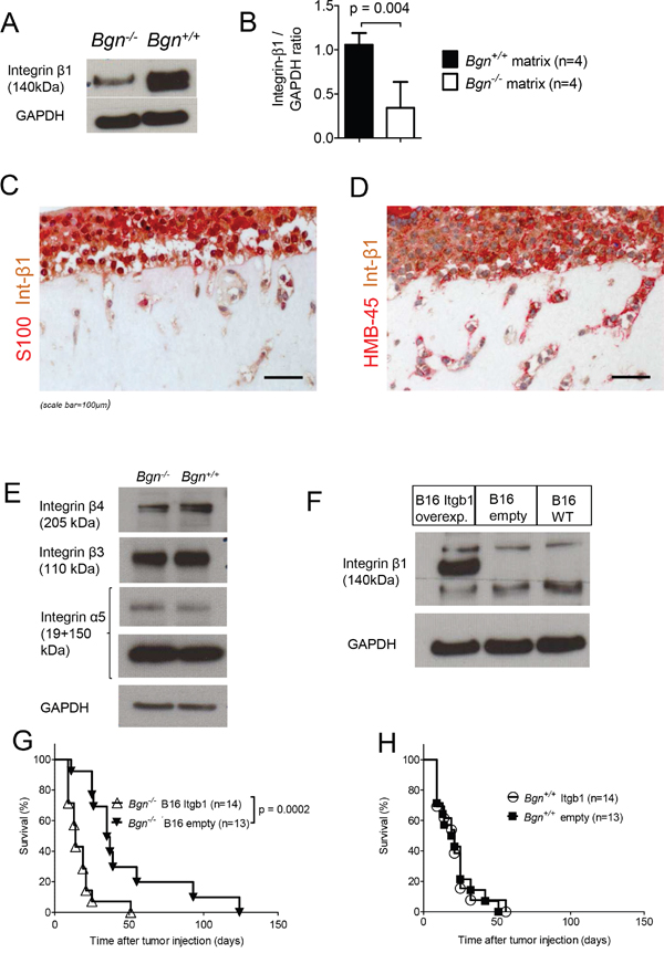 To understand if the low integrin-β1 expression/low invasiveness phenotype of melanoma cells derived from a Bgn-/- matrix could be reversed, we overexpressed integrin-β1 in B16 melanoma cells. Overexpression of integrin-β1 was effective (Figure 5F) and the injection of the integrin-β1 overexpressing melanoma cells (B16) abolished the survival benefit we had previously seen in Bgn-/- mice (Figure 5G). Survival of melanoma bearing mice was altogether slightly better than in previous experiments using unmodified melanoma cells. This could be due to the genetic modification of the cells with empty vector or integrin- β1 vector. Consistent with this concept, we observed a slower growth of the gene modified B16 cells in the cell culture. Consistent with the concept that integrin-β1 overexpression reversed the Bgn-related survival benefit, no enhanced tumor-related mortality was seen when integrin-β1 overexpressing melanoma cells were compared to empty-vector melanoma cells in Bgn+/+ mice (Figure 5H). These findings indicate a functional connection between the lack of Bgn leading to low integrin-β1 expression and reduced melanoma invasiveness seen in vivo.