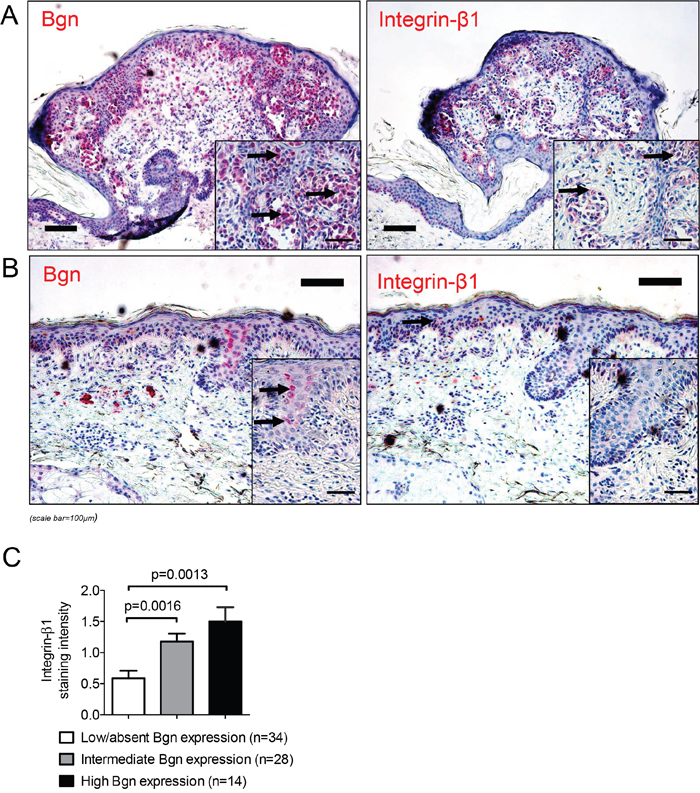 Figure 6: The levels of Bgn and integrin-β1 in melanoma tissue correlate. (A) Immunohistochemical staining of Bgn (left image) and integrin-β1 (right image) in a representative human melanoma sample with high Bgn and integrin-β1 expression levels (black arrows point to red staining of Bgn and integrin-β1). (B) Low staining intensity of integrin-β1 in a patient sample with low biglycan staining intensity (black arrows point to red staining of Bgn and integrin-β1). (C) Quantification of integrin-β1 in the primary tumors of patients stratified according to low/absent, intermediate and high Bgn expression. Patients characteristics are given in Supplementary Table 1.
