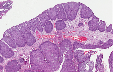 Figure 1: IP characterized by an inverted pattern of growth with cords and nests of epithelium endophytically projecting into the underlying stroma (H&E; 100×).