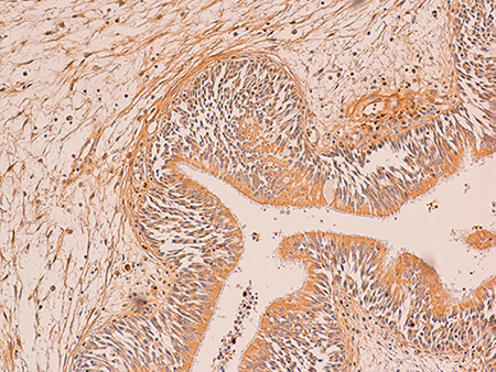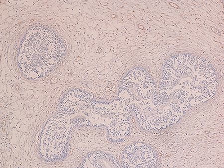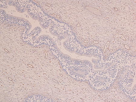 Figure 2: The epithelial cells of primitive IP were negative for progesterone receptor (immunoperoxidase; 100×).