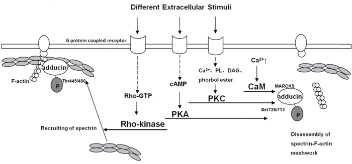 Figure 1: Model for different pathways of adducin phosphorylation [11, 26–36]. A spectrin-F-actin meshwork is linked to the membrane by association with membrane accessory proteins such as band 4.1. Upon the activation of Rho-kinase by Rho during the action of extracellular stimuli, α-adducin is phosphorylated at Thr445 and Thr480. Phosphorylated α-adducin binds to F-actin and then facilitates the recruitment of spectrin to F-actin. This may promote the formation of a spectrin-F-actin meshwork beneath membrane. On the other hand, phosphorylated α-adducin at Ser726 by PKA or PKC, and at MARCKS through Ca2+/CaM inhibits the activity of adducin in recruiting spectrin to F-actin and functioning as an actin capping protein.